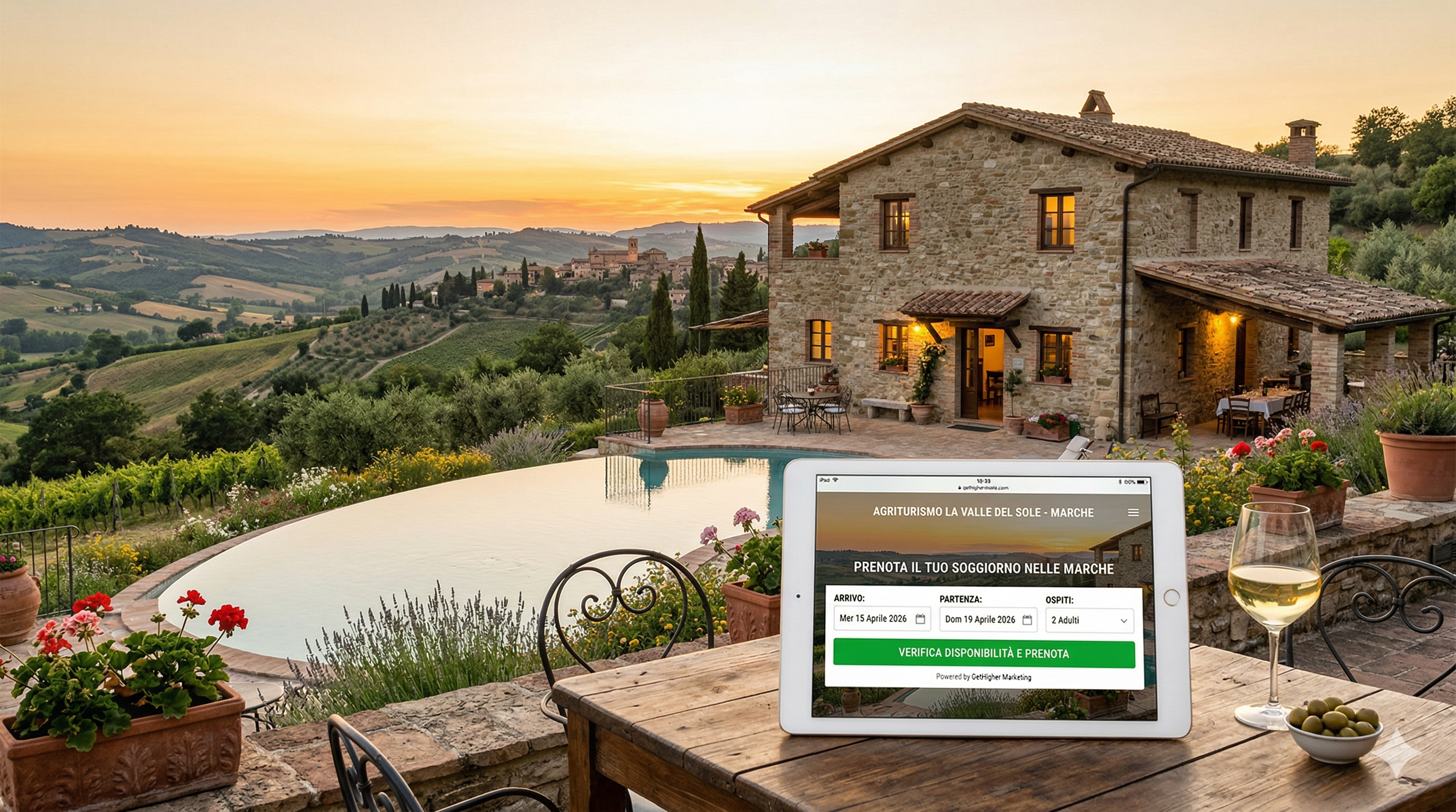 Borgo Condé Wine Resort (Fiumana di Predappio). Pur avendo le dimensioni e i comfort di un grande resort di lusso, mantiene intatta l'anima e la filosofia del turismo rurale. La loro chiave di successo è stata posizionarsi strategicamente su Google e sui social network come destinazione enogastronomica d'eccellenza. Ottimizzando il loro booking engine proprietario e creando pacchetti "soggiorno + degustazione in cantina", hanno disintermediato le vendite ottenendo una formidabile crescita prenotazioni dirette. Hanno compreso perfettamente che chi cerca un agriturismo di questo livello desidera un'esperienza fluida ed emozionale fin dal primo clic sul sito web.