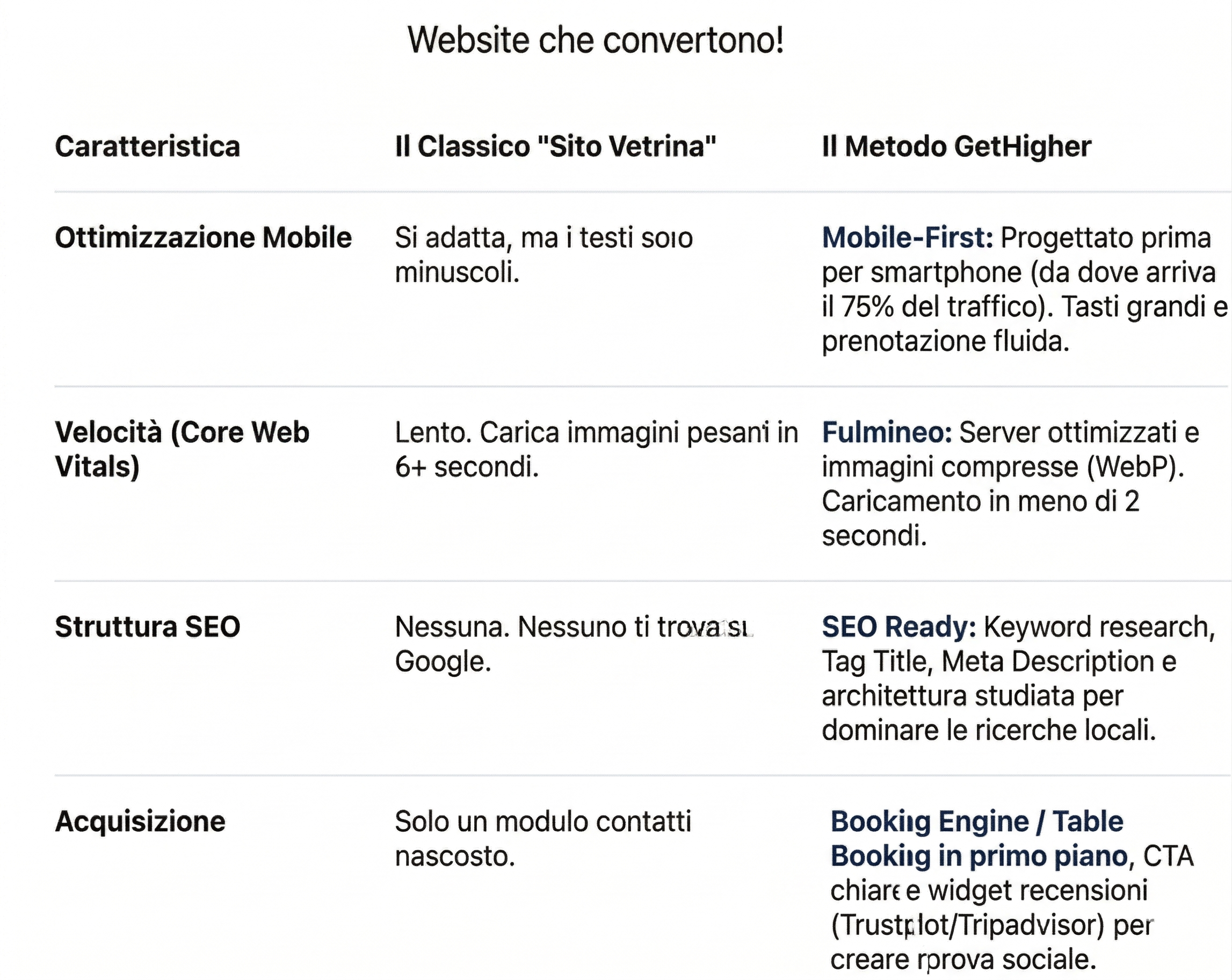 Per la ristorazione, la velocità è tutto. L'utente cerca il menu e vuole prenotare il tavolo, spesso dal cellulare in mezzo alla strada.